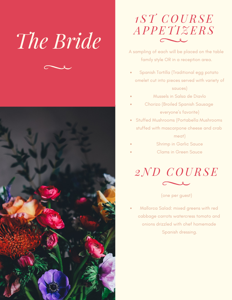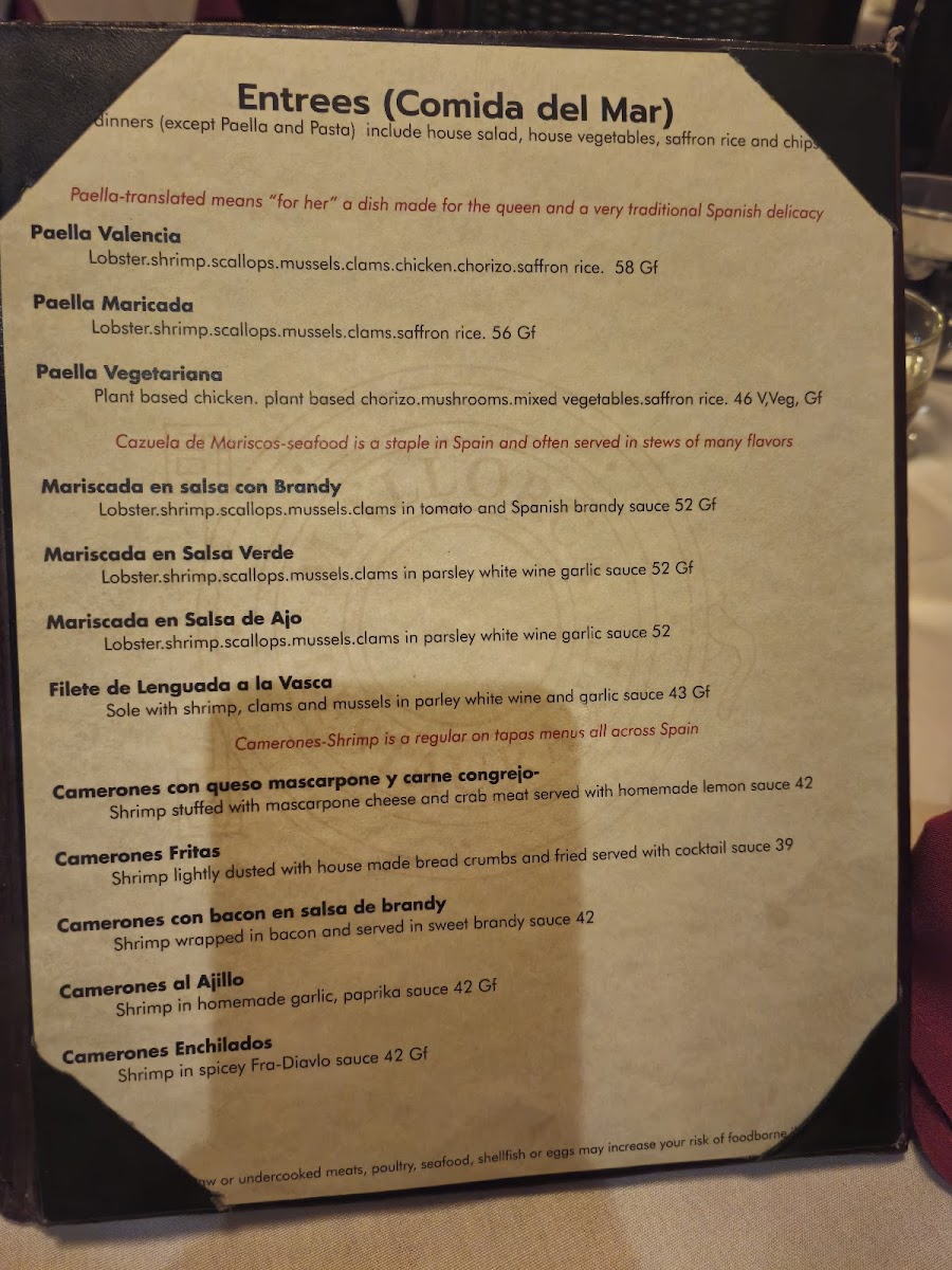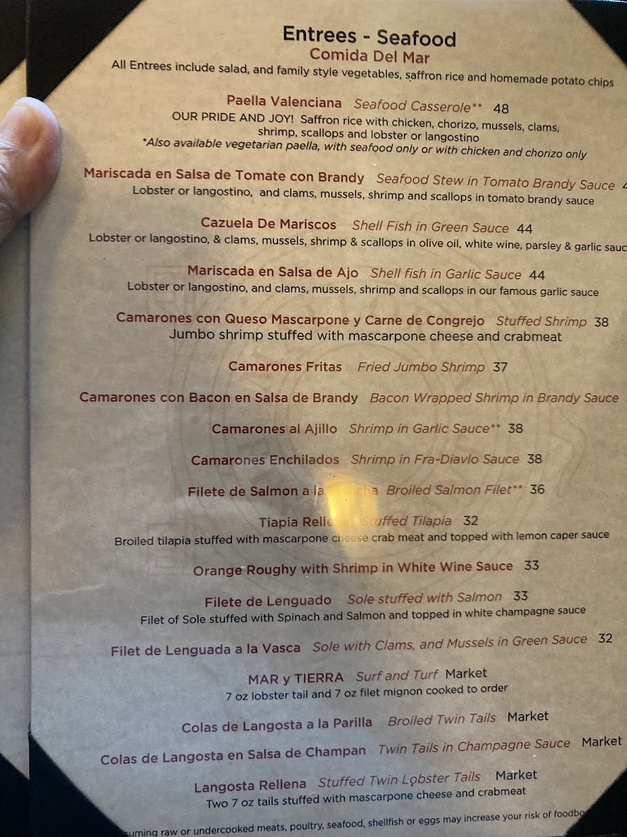 ALL ENTREES (Except Pasta) SERVED WITH House Salad, Saffron Rice, Vegetables, and Spanish Potato Chips.