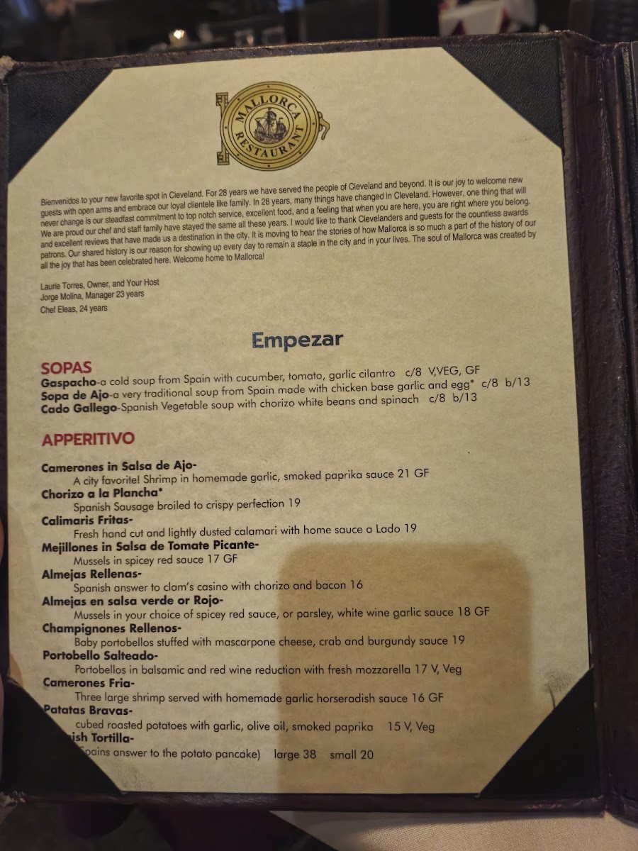 Located at 1390 W 9th St in Cleveland, OH, Mallorca offers a menu full of vibrant Mediterranean flavors that transport you straight to the heart of Spain. From savory tapas to rich, satisfying entrees, every dish is crafted with the finest ingredients and the utmost care. The Mallorca Menu features an array of traditional Spanish dishes, such as seafood paella, tender grilled meats, and fresh salads that burst with flavor. Whether you're in the mood for a light bite or a hearty feast, this menu has something for everyone. With a variety of appetizers and mains to choose from, each dish captures the essence of Mediterranean cuisine, all while offering a cozy, welcoming atmosphere perfect for enjoying a delicious meal with friends and family.